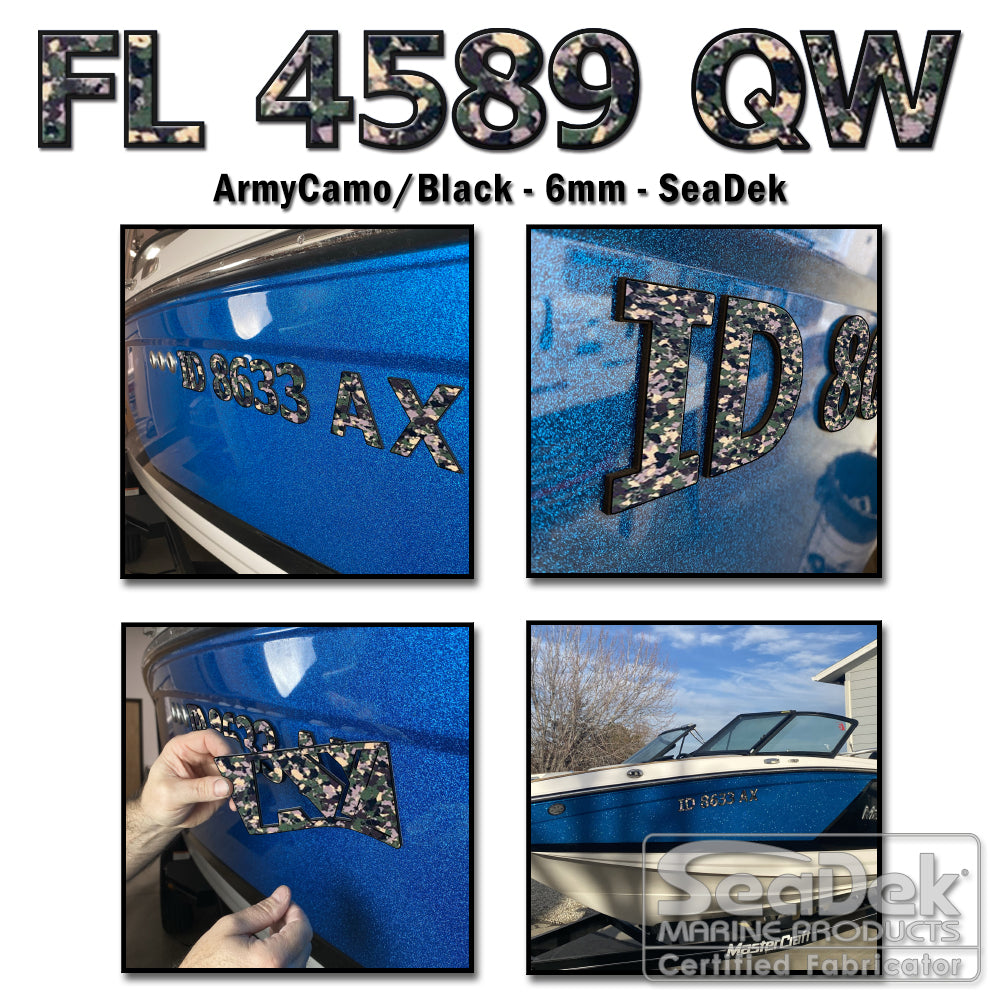 - 3" Tall | Regulation Size Letters & Numbers / Set of Two / One For Each Side - This item is ArmyCamo on top layer and Black on the bottom layer. - Custom Made With Your Unique Number & Letters. - Genuine SeaDek / Weather, Stain & Mildew Resistant / 6mm Dual-Layer - Easy to Install / Pre-Aligned & Spaced / Peel & Stick / Hi-Bond Adhesive - Designed For Marine Application - Install On Fiberglass Boats, Personal Watercraft & Jet Skis - PLEASE ENTER YOUR BOAT REGISTRATION NUMBERS IN THE FIELD BELOW.