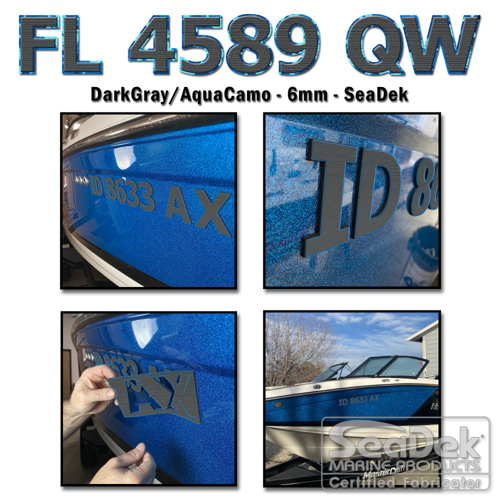 - 3" Tall | Regulation Size Letters & Numbers / Set of Two / One For Each Side - This item is DarkGray on top layer and AquaCamo on the bottom layer. - Custom Made With Your Unique Number & Letters. - Genuine SeaDek / Weather, Stain & Mildew Resistant / 6mm Dual-Layer - Easy to Install / Pre-Aligned & Spaced / Peel & Stick / Hi-Bond Adhesive - Designed For Marine Application - Install On Fiberglass Boats, Personal Watercraft & Jet Skis - PLEASE ENTER YOUR BOAT REGISTRATION NUMBERS IN THE FIELD BELOW.