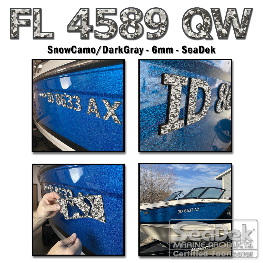 - 3" Tall | Regulation Size Letters & Numbers / Set of Two / One For Each Side - This item is SnowCamo on top layer and DarkGray on the bottom layer. - Custom Made With Your Unique Number & Letters. - Genuine SeaDek / Weather, Stain & Mildew Resistant / 6mm Dual-Layer - Easy to Install / Pre-Aligned & Spaced / Peel & Stick / Hi-Bond Adhesive - Designed For Marine Application - Install On Fiberglass Boats, Personal Watercraft & Jet Skis - PLEASE ENTER YOUR BOAT REGISTRATION NUMBERS IN THE FIELD BELOW.
