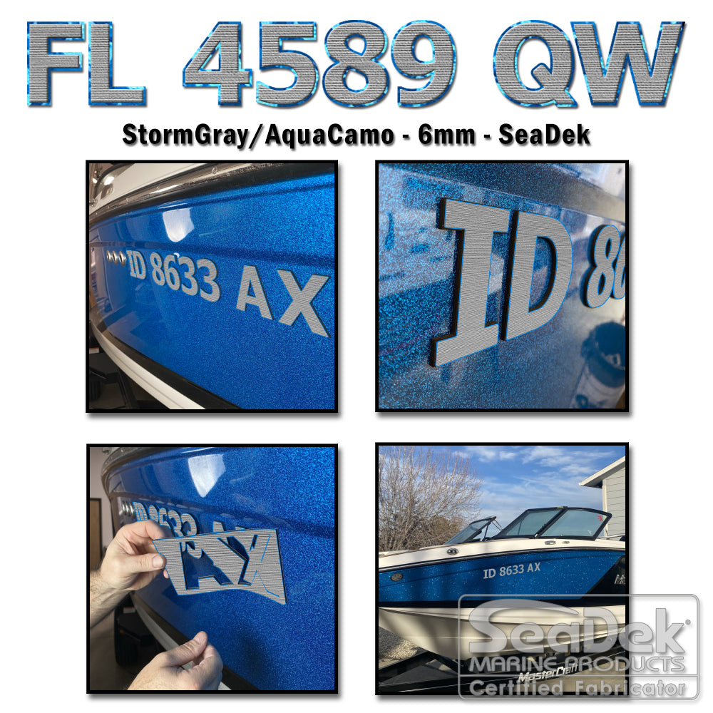 - 3" Tall | Regulation Size Letters & Numbers / Set of Two / One For Each Side - This item is StormGray on top layer and AquaCamo on the bottom layer. - Custom Made With Your Unique Number & Letters. - Genuine SeaDek / Weather, Stain & Mildew Resistant / 6mm Dual-Layer - Easy to Install / Pre-Aligned & Spaced / Peel & Stick / Hi-Bond Adhesive - Designed For Marine Application - Install On Fiberglass Boats, Personal Watercraft & Jet Skis - PLEASE ENTER YOUR BOAT REGISTRATION NUMBERS IN THE FIELD BELOW.